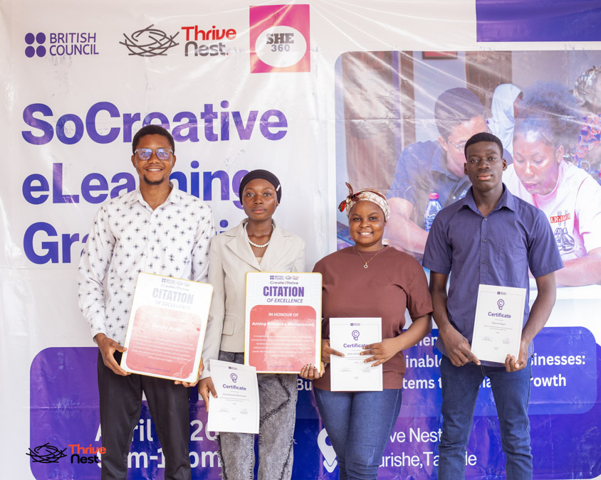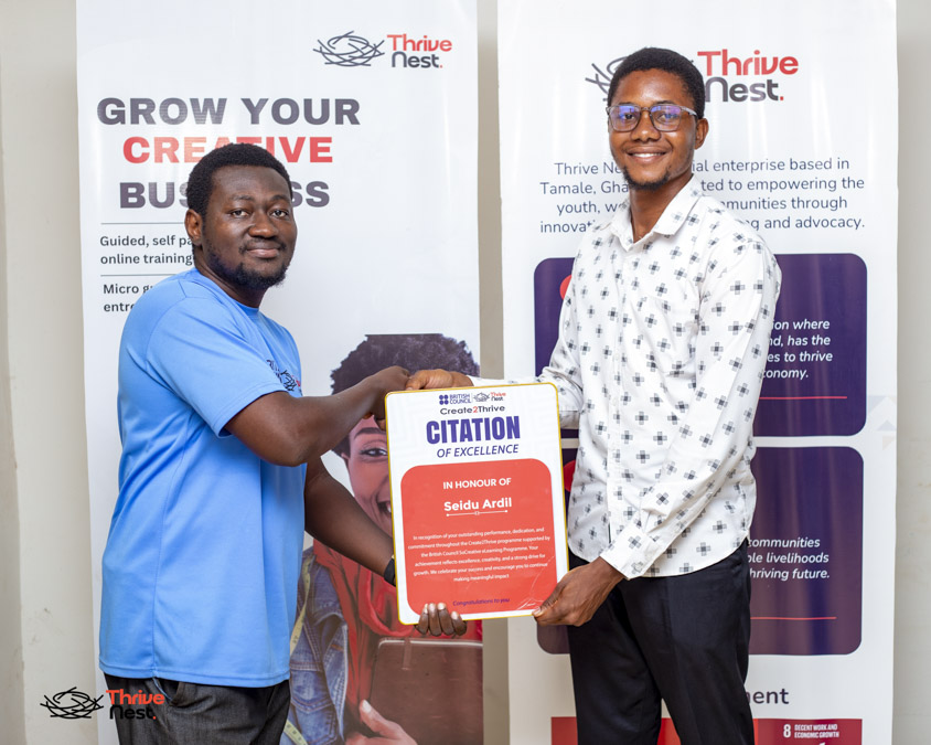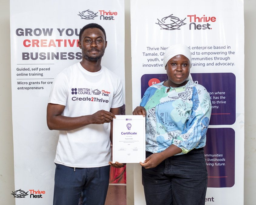 On 27th April 2026, Thrive Nest hosted the graduation ceremony for the Create2Thrive Programme at its head office in Tamale. The programme, supported by the British Council under the SoCreative e-Learning Programme, marked a significant step in empowering creatives and early-stage entrepreneurs with practical skills to build and sustain their ventures.